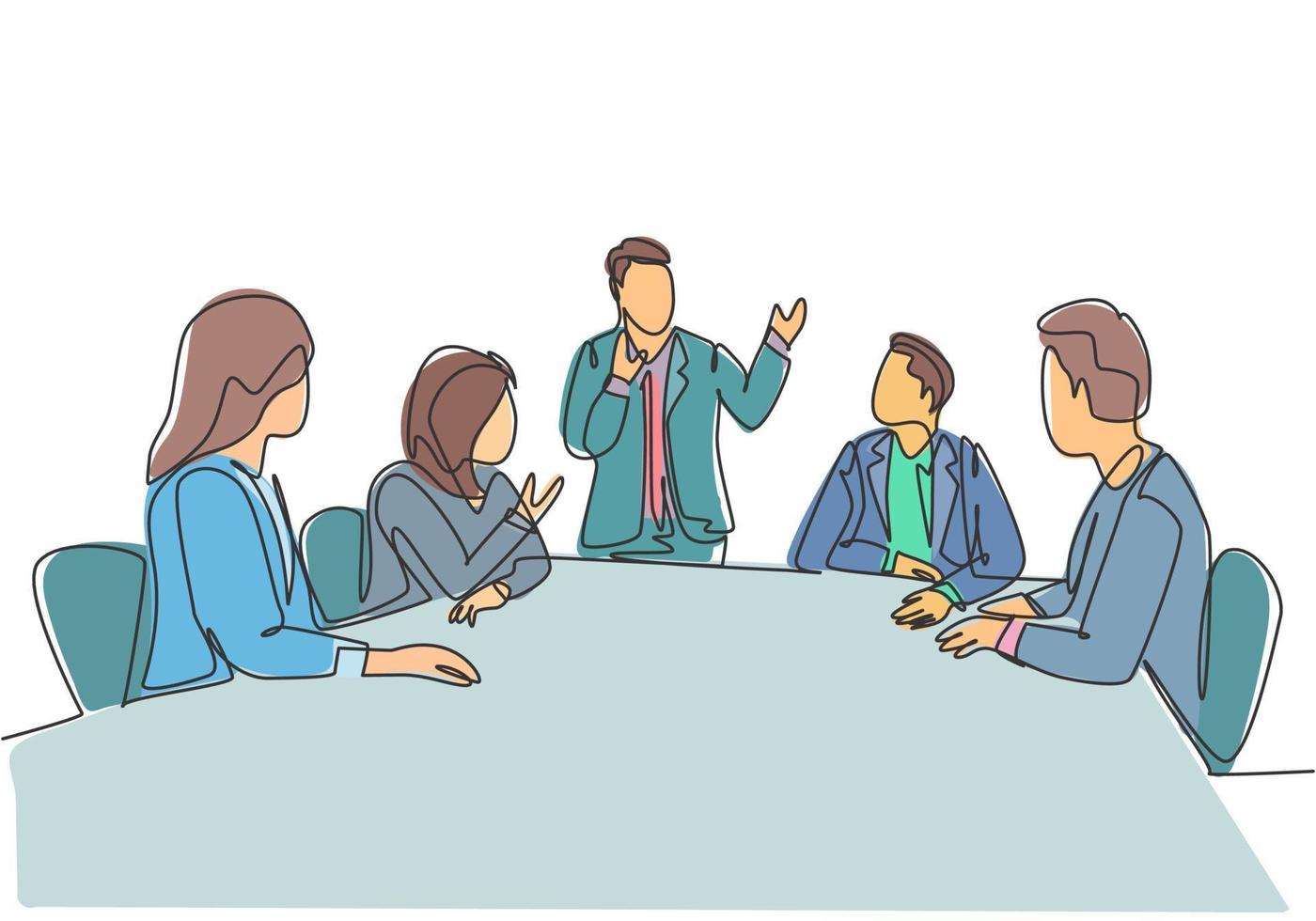 - one-continuous-line-drawing-of-young-happy-board-of-directors-discussing-company-profit-sharing-during-meeting-business-training-concept-trendy-single-line-draw-design-graphic-illustrat